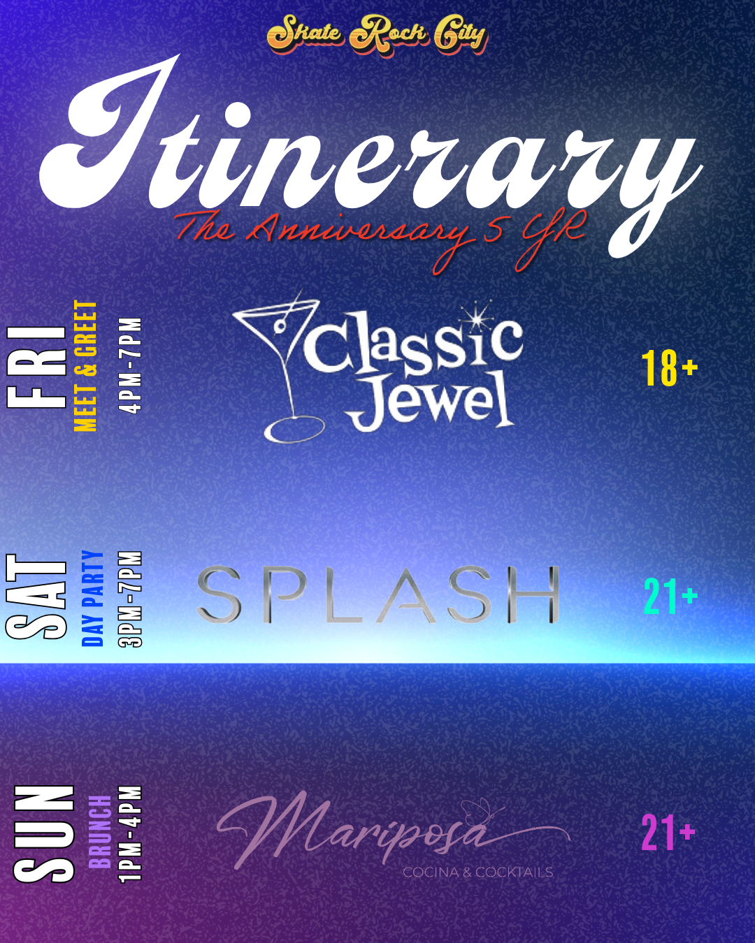We invite you to the 5th Year Anniversary at Skate Rock City — a celebration of five incredible years of skating, music, community, art, and good times. Over the years, Skate Rock City has grown into more than just a venue — it’s become a place where skaters, music lovers, families, and friends connect, express themselves, and celebrate culture. This anniversary is our way of saying “Thank you” to everyone who’s rolled through, supported, and believed in us-Let The Good Times Roll!